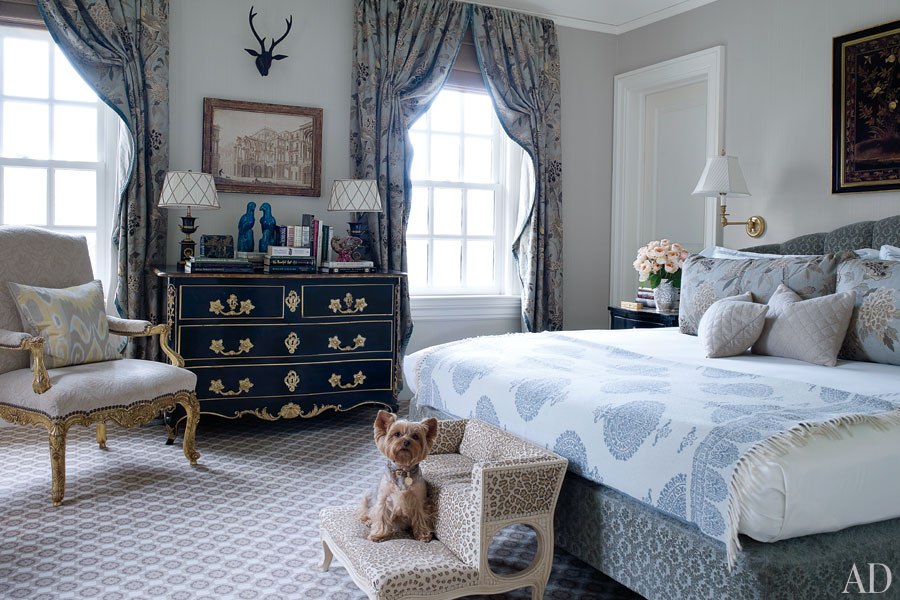 "Teddy, a Yorkshire terrier, perches on leopard-spot bed steps in [Alex] Papachristidis's room; the commode is 18th-century French, the throw is by Anichini, and the carpeting is by David Easton for Beauvais."