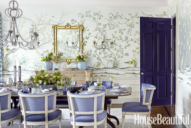 "Splashes of color and glamour provide the surprise that defines Poole's style. . . . In the dining area, the couple hung a panel of framed de Gournay wallpaper to set the scene for a Jean Prouve sideboard and dining table and Robsjohn-Gibbings chairs."